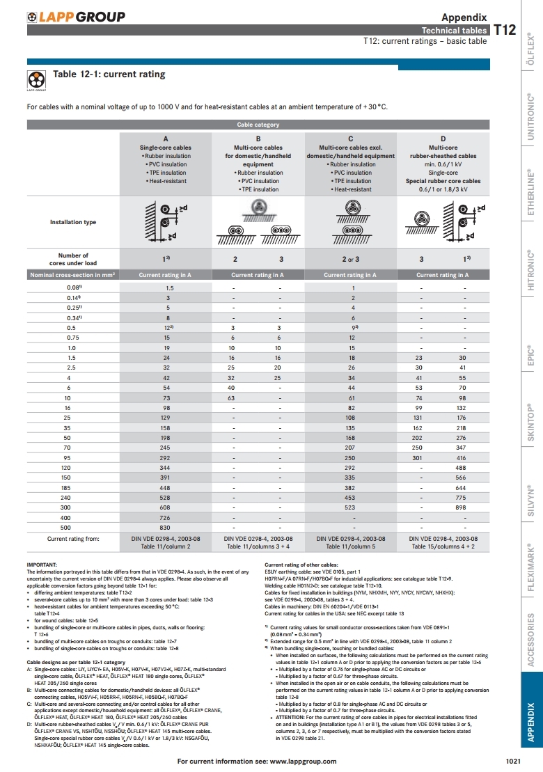 LAPP_Çã¿ëÀü·ùÇ¥_T12 Current ratings_ basic table-1.pdf